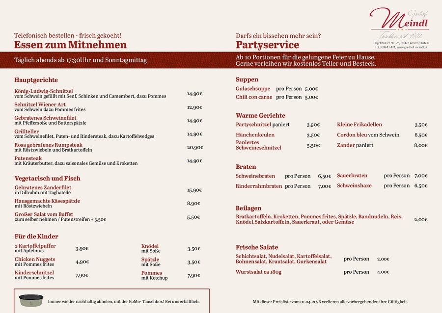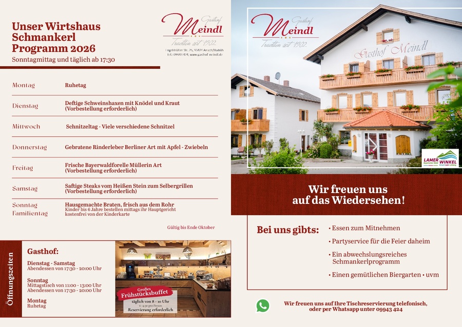 Täglich von 17:30-20:00 UhrAm Sonntag zusätzlich von 11-13 Uhr mit ofenfrischen Braten